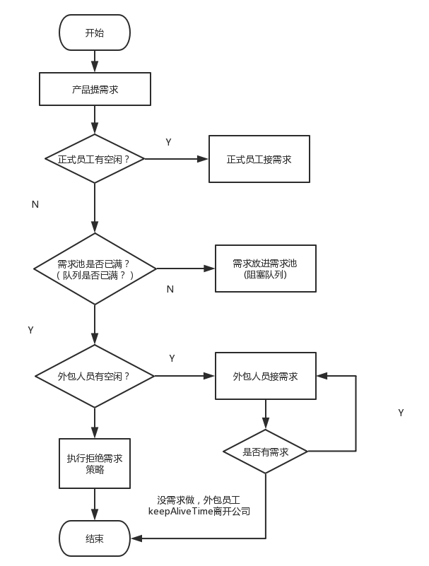 ·如果外包员工把需求做完了,它经过一段(keepAliveTime)空闲时间,就离开公司了。