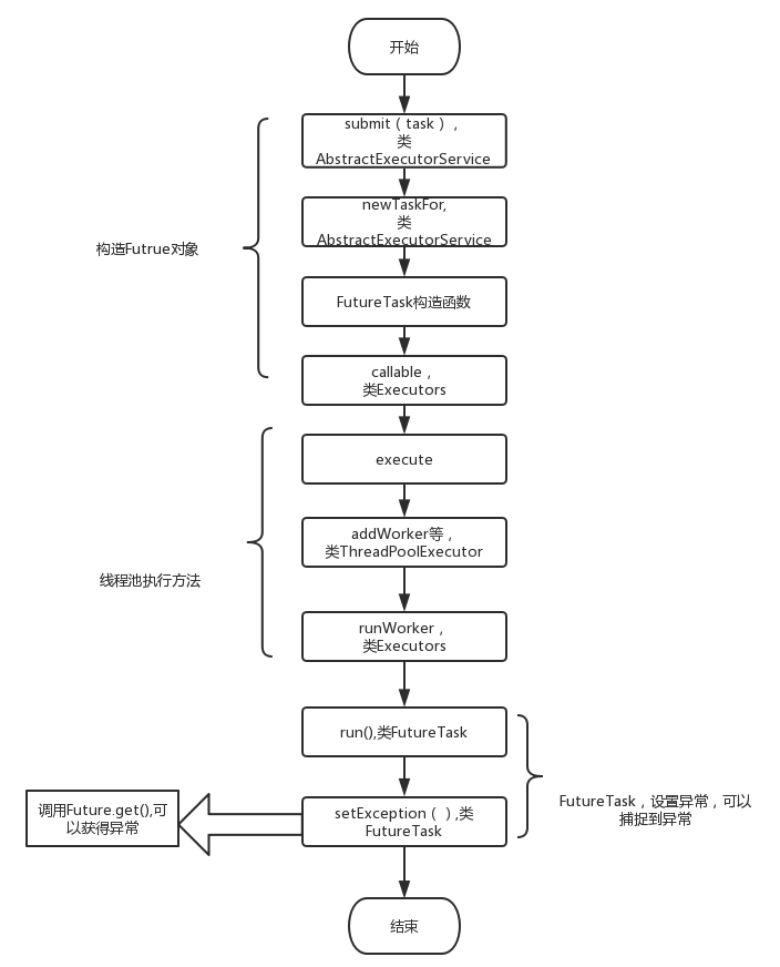 通过debug上面有异常的submit方法(建议大家也去debug看一下,图上的每个方法内部是我打断点的地方),处理有异常submit方法的主要执行流程图: